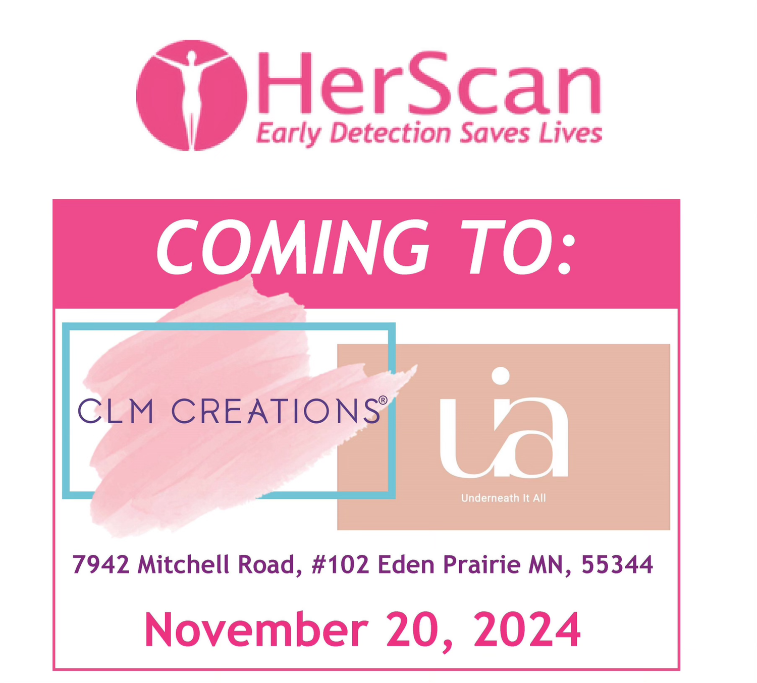 CLM CREATIONS along with Underneath It All in Eden Prairie, Minnesota have been hosting HerScan’s Day of Breast Health 2 or 3 times per year making early breast cancer detection possible for 10-12 women each day.