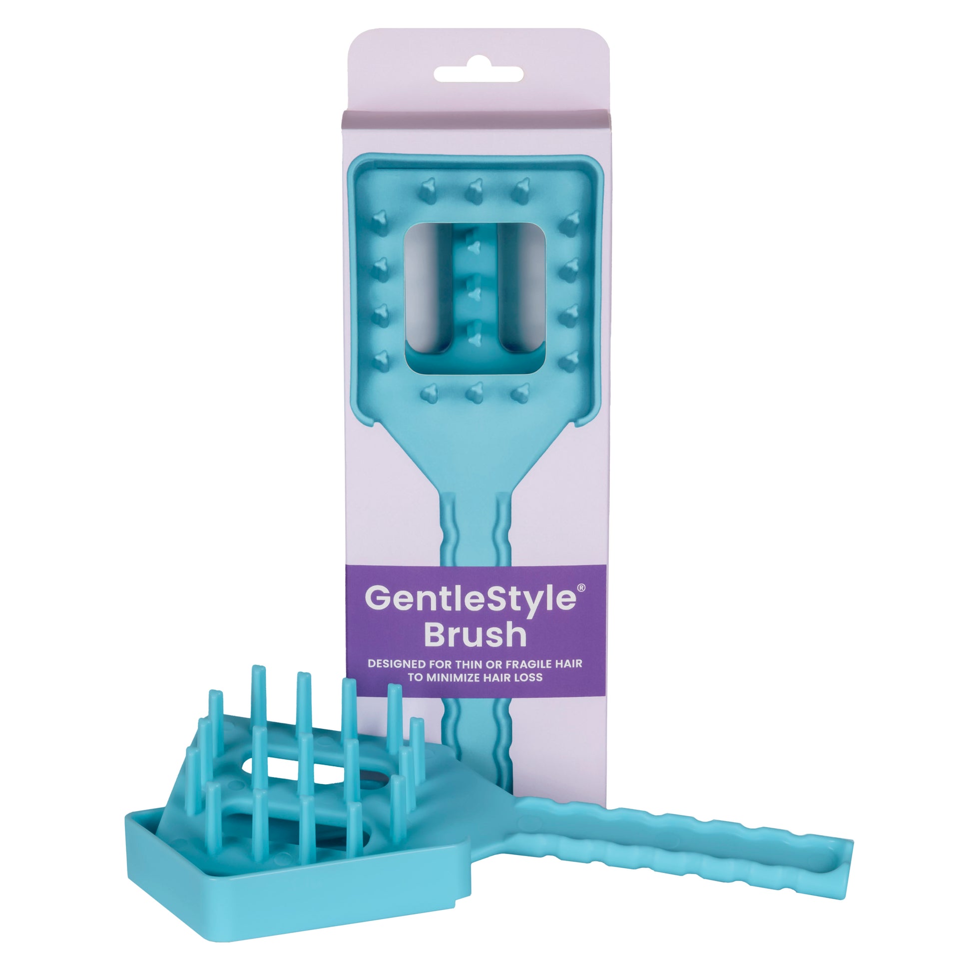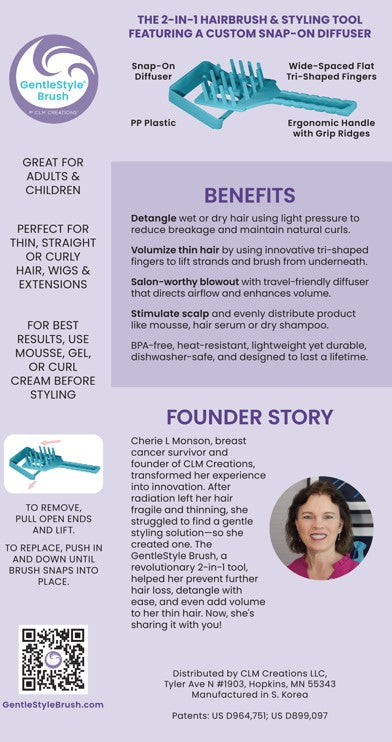 The GentleStyle Brush is a 2-in-1 detangling hairbrush & styling tool designed for thin or fragile hair to minimize hair loss, eliminates the need for additional styling tools and works with various hair types, lengths, textures, wigs, and hair extensions.